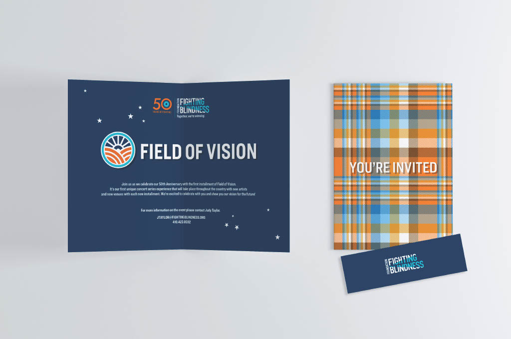 I contributed to the Field of Vision charity concert series for the Foundation Fighting Blindness by designing the event logo, invitations, and a custom gift item. The Foundation Fighting Blindness is a leading nonprofit organization dedicated to funding research to prevent, treat, and ultimately cure retinal degenerative diseases that cause vision loss.