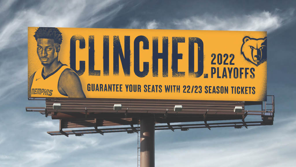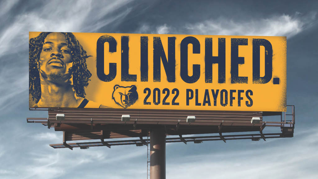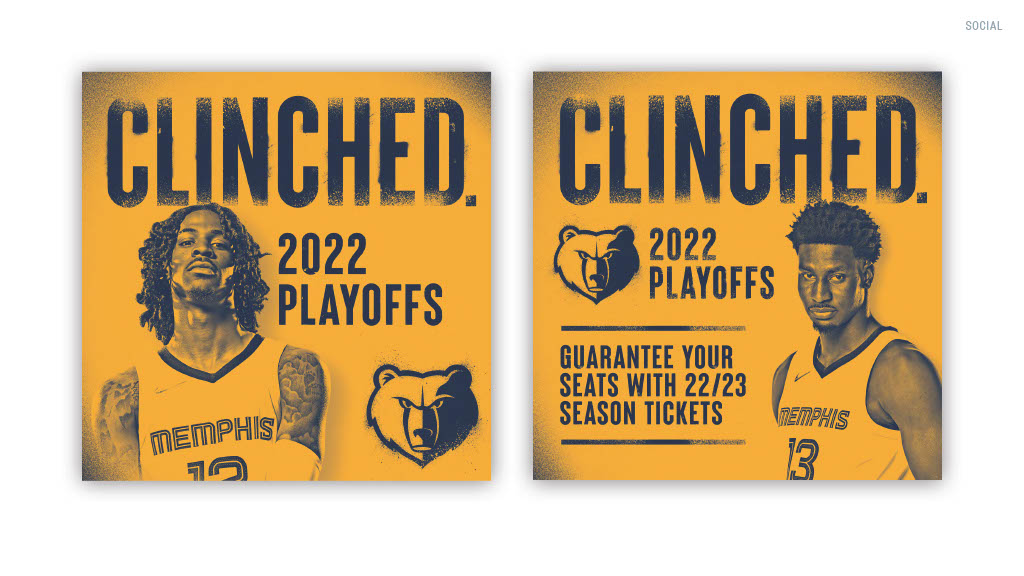 While working at Red Deluxe, I contributed to the creative for the Memphis Grizzlies’ 2022 NBA Playoff run, anchored by the rallying slogans MEMTHIS and CLINCHED. The look centered on a bold gold color palette—symbolizing first place, trophies, and championship ambition—layered with dark blue spray-paint textures to bring grit and intensity to the imagery. Featuring Ja Morant during the peak of the Grizzlies’ rise, the campaign balanced polish and raw energy, creating a unified playoff identity across digital and in-arena assets.
